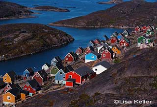 The town of Kangamiut is a great photo opportunity. The variety of bright color houses set in the mountain is unique and picturesque. I recommend climbing to the top of the mountain that over looks the town to capture some interesting pictures of landscape and scenery. I used my 28-70mm lens so I could get the entire town set in the mountain in my frame. My circular polarizer filter came in handy since there was still a slight morning haze over the town. The polarized filter helped to deepen the different colors of the houses and bring out more of the contrast of the rocky landscape and water. The water in Kanagamiut is extremely clear with many shades of blue. That morning the sunrays were just bouncing off the water making everything sparkle.